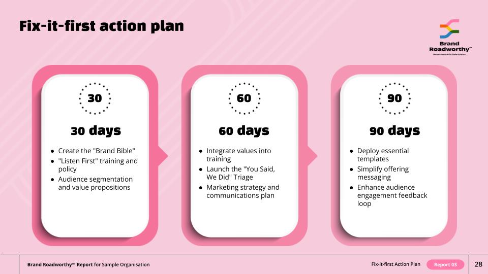 After the diagnostic is complete, you’ll receive an overall Brand Health Scorecard with measurable fitness across four pillars, an executive report with insights into what’s strong, weak, or at risk and a Fix-It-First Action Plan with a 90 day and beyond priority actions for immediate improvement.