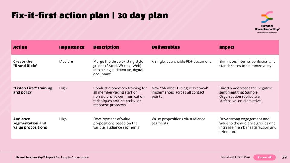 This is the most valuable part. It’s a prioritised roadmap structured for immediate implementation: